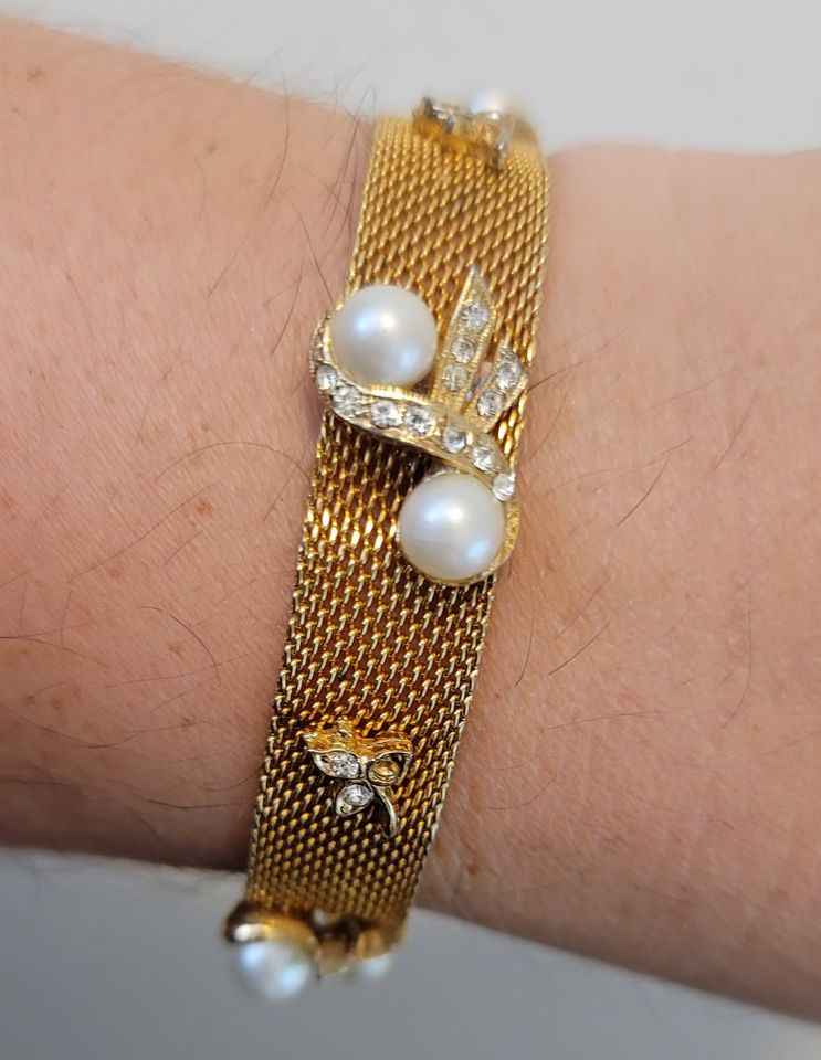 Vintage Gold Tone Mesh Simulated Pearl Bracelet