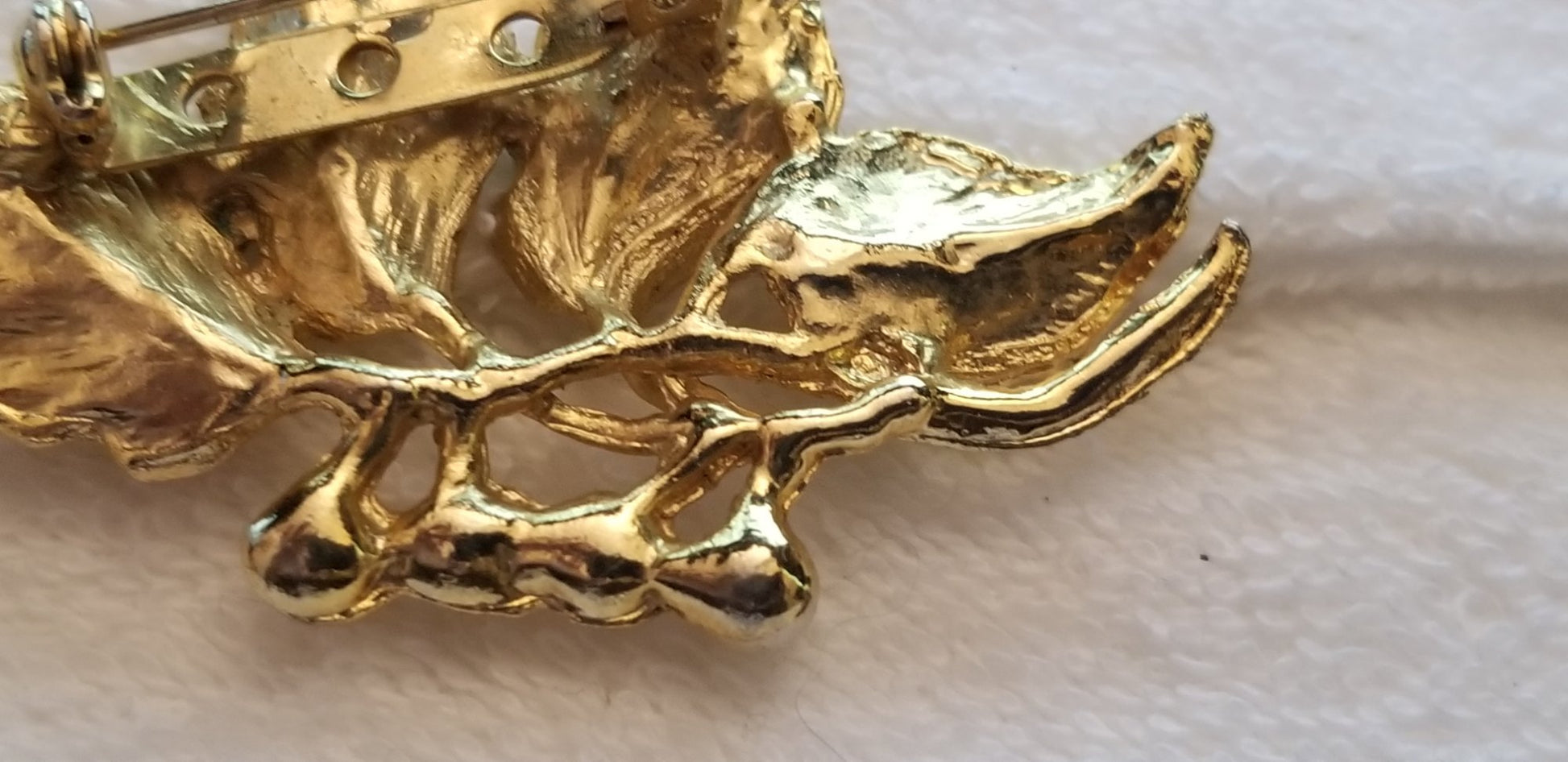 Condition: in good preowned wearable condition. Has simulated pearl beads. 4 leaves on a branch, with 4 simulated pearls. Pin is functional.