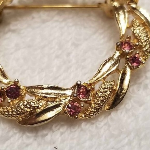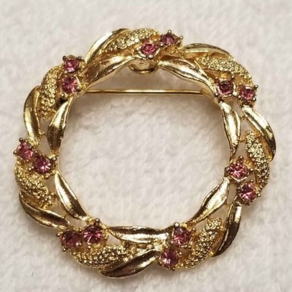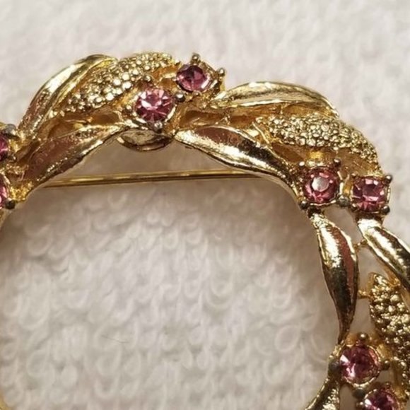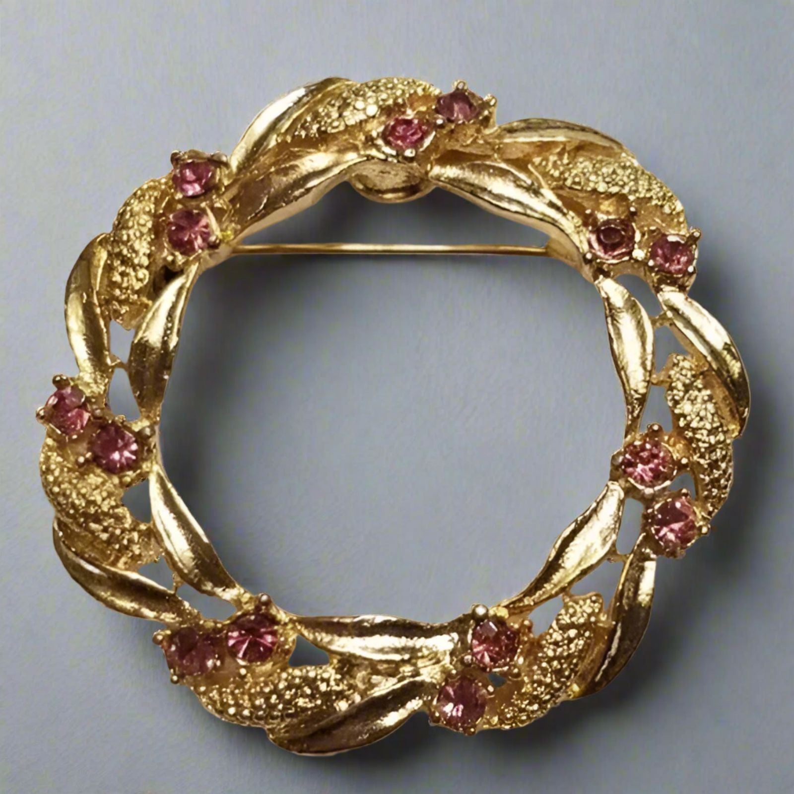 Vintage Gerry’s Wreath Brooch – Gold Tone Circle Pin with Pink Rhinestones