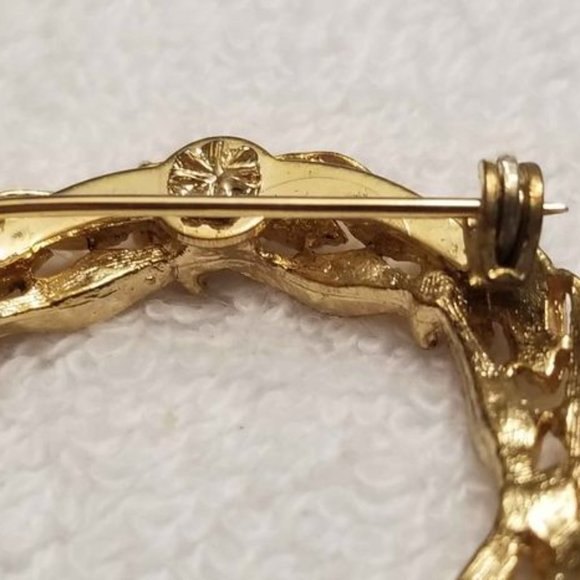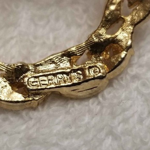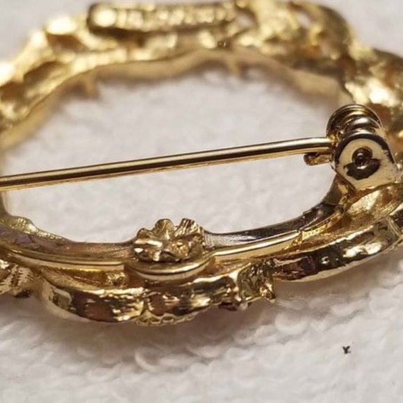 This vintage brooch by Gerry’s features a beautifully textured gold-tone wreath design accented with sparkling pink rhinestones. Known for their detailed costume jewelry, Gerry’s created timeless pins that remain highly collectible today. The circular design makes this piece versatile — perfect for everyday wear or as a finishing touch to holiday or formal outfits.