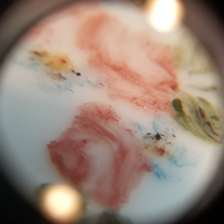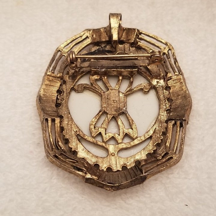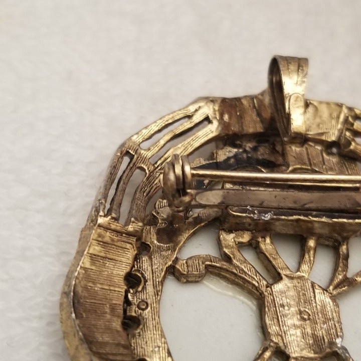 gold tone frame, white ceramic cabochon. hand painted flowers and leaves