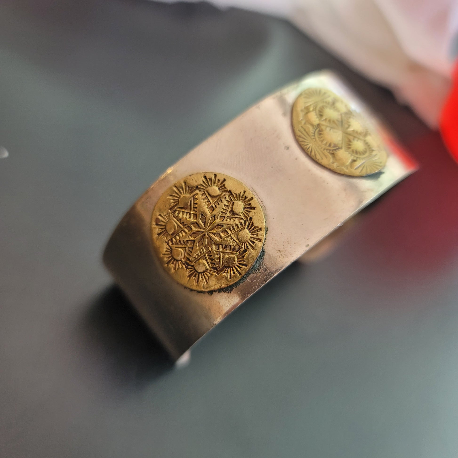The metal cuff has 3 round copper, possible brass pieces. Mandala style pattern.