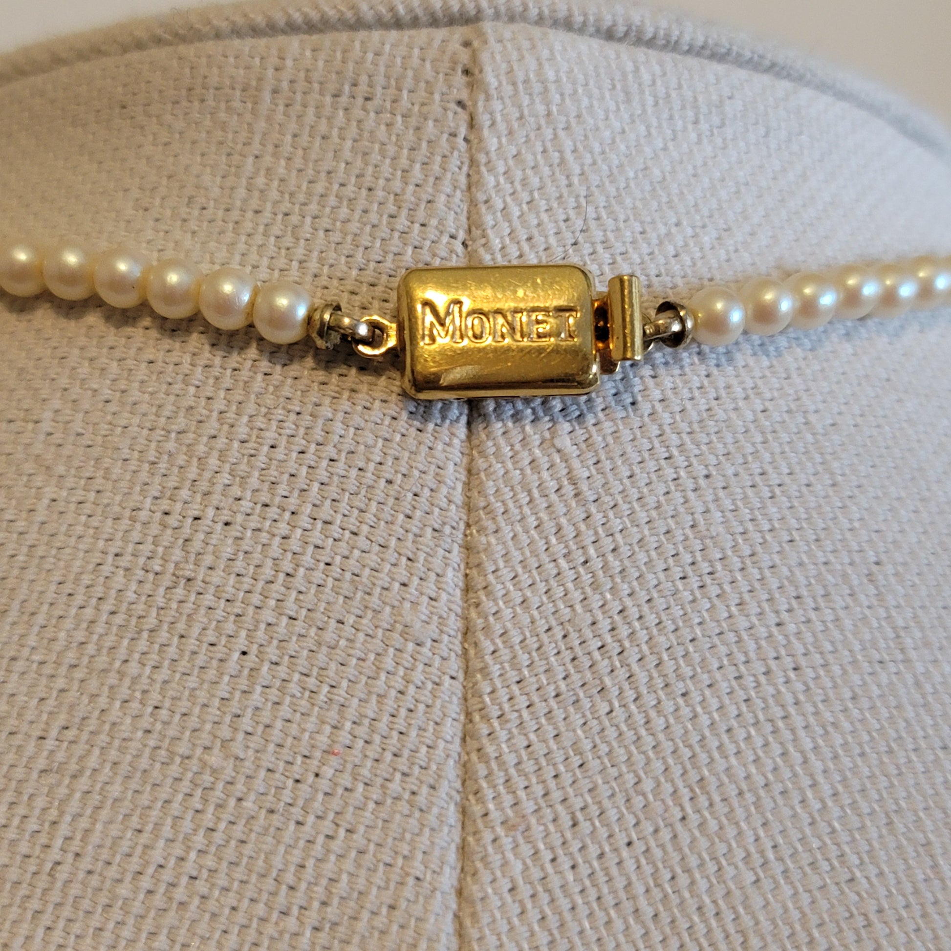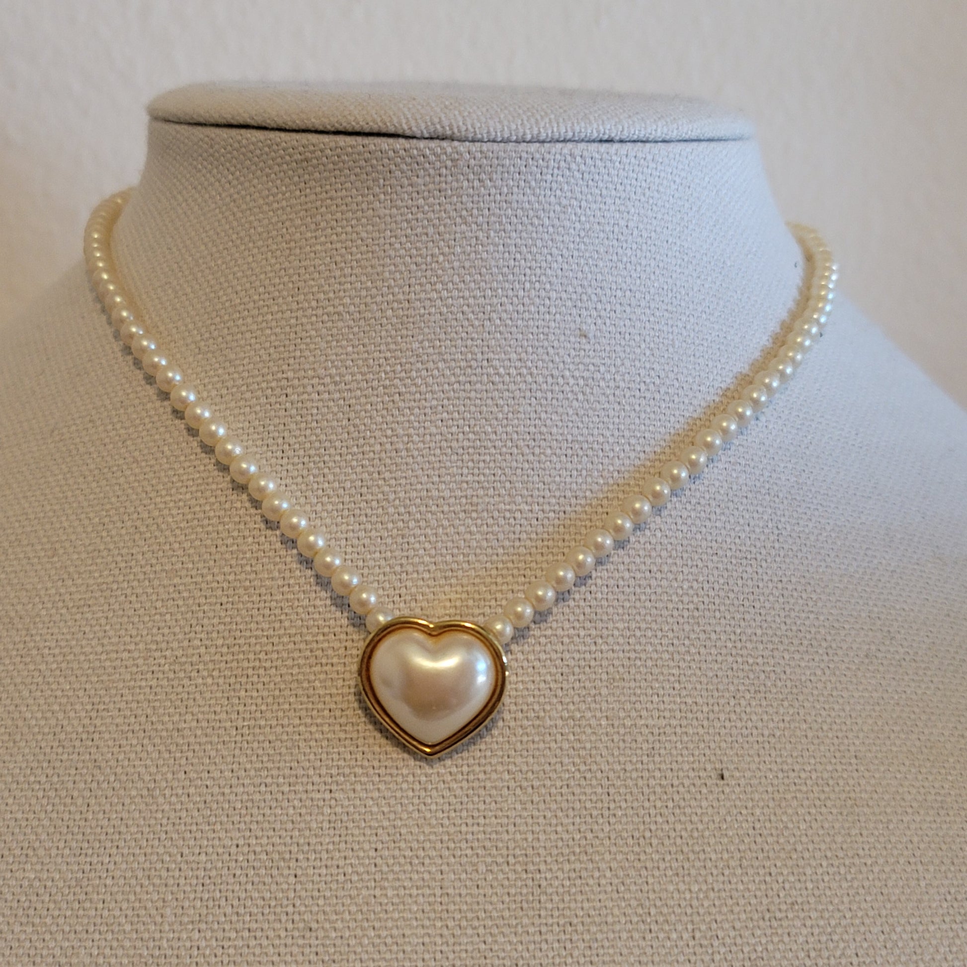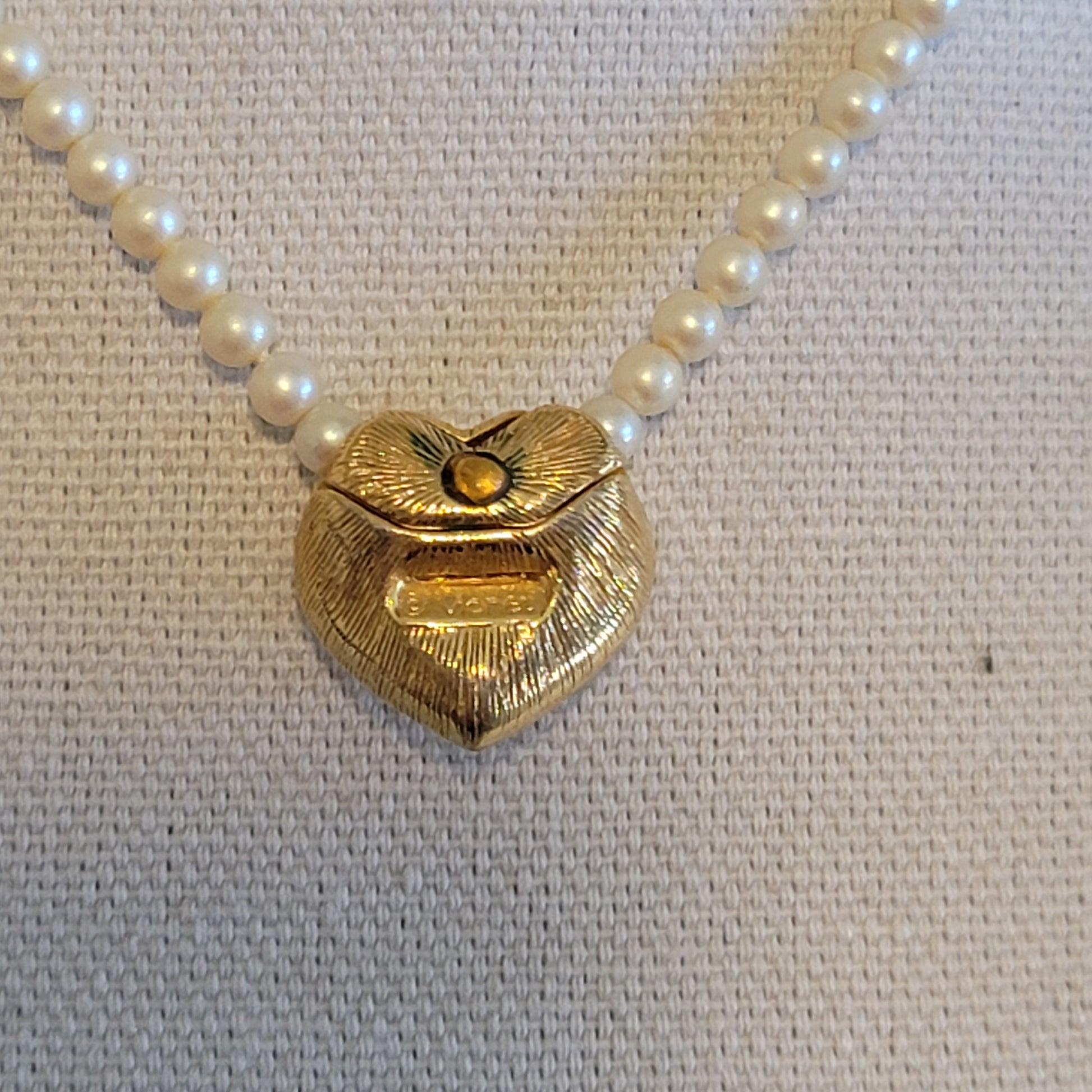 Simulated Pearl Beads, puffed heart. Has some signs of wear on the back of the heart., clasp also shows signs of wear.
