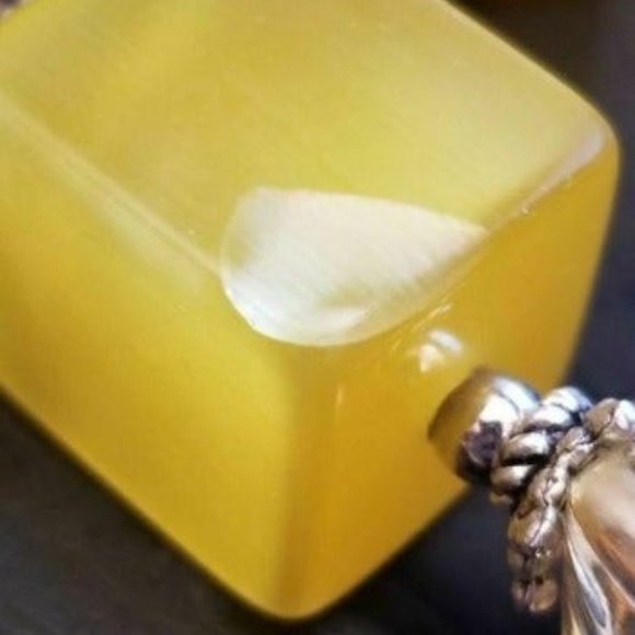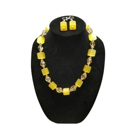 one of the cubes have a crack in it. but other then that, it is in good preowned condition Necklace and earrings weigh about